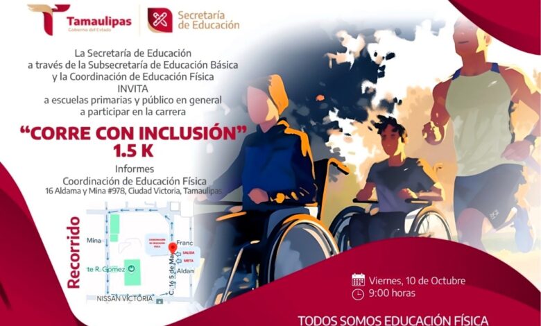 Ciudad Victoria, Tamaulipas.- Con la finalidad de eliminar barreras, fomentar un sentido de pertenencia y promover la diversidad, equidad y justicia para construir una comunidad más justa e integrada, en el cierre de la Semana Internacional de la Educación Física y Deporte por primera vez en la historia se estará celebrando la Carrera Atlética “Corre con Inclusión” el próximo viernes 10 de octubre a las 9:00 horas con meta de salida y llegada en la calle 16 Aldama y Mina frente a las oficinas de la Coordinación Estatal de Educación Fisica .